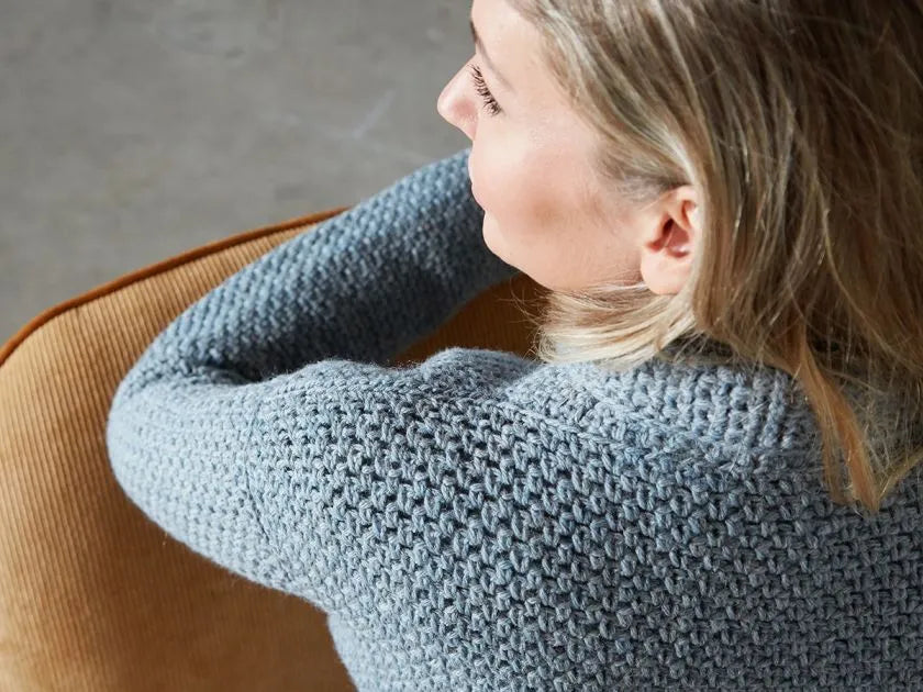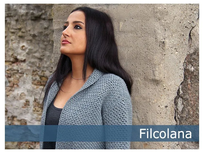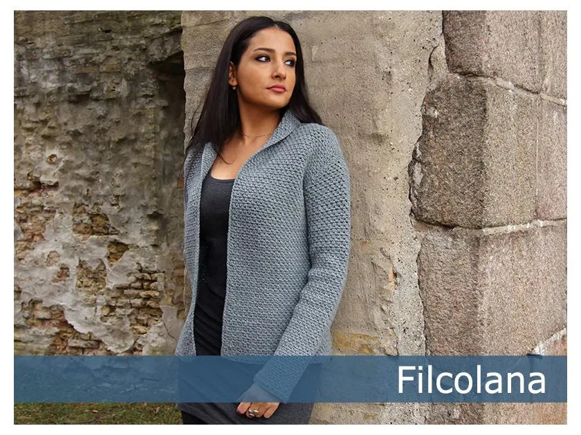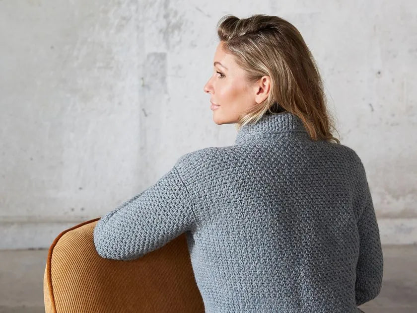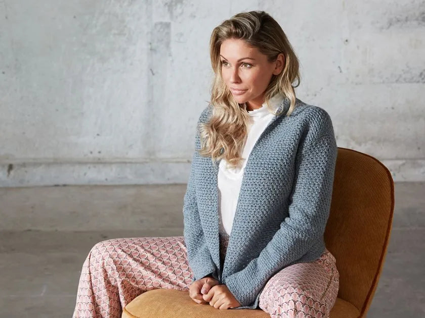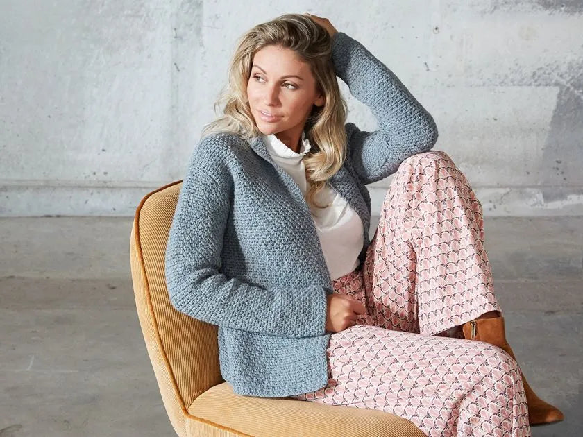 Andesite er en virkelig flot, klassisk, hæklet jakke. Jakken er fint taljeret med ind-og udtagninger i sidesømmene.