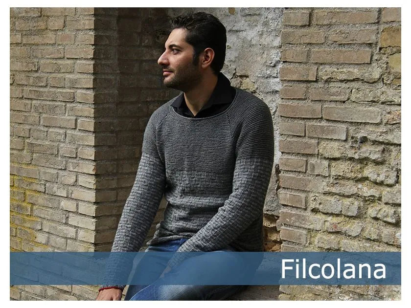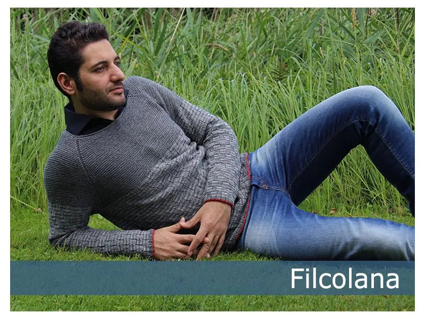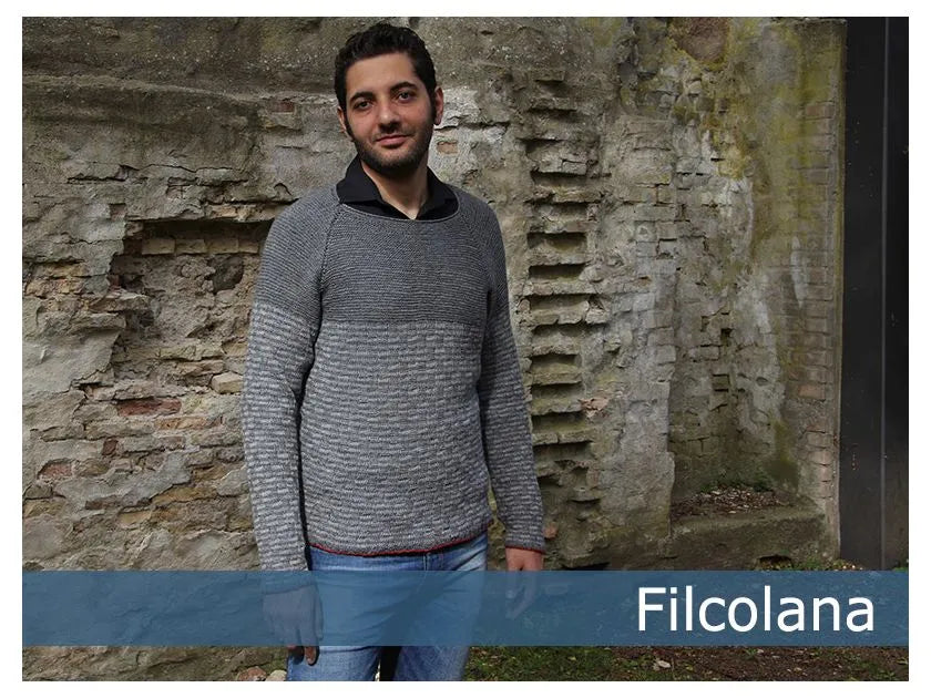 En klassisk, tynd herresweater med raglanærmer og et lille tvist: En lille rustrød kant langs opslagningen forneden og på ærmerne. Det ensfarvet bærestykke understreger herrernes bredde skuldre.