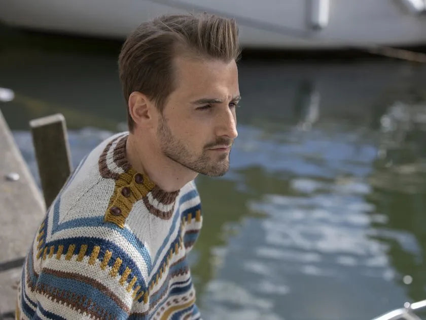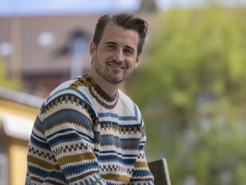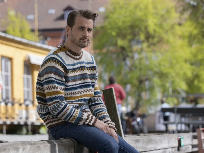 Skønnere farver og mønster i en sweater skal man lede længe efter. Sweateren er tænkt til herre, men kan selvfølgelig også strikkes til kvinder. Leg med farverne, og ton dem op eller ned, alt efter hvilket udtryk du ønsker dig i din færdige sweater. Hvis du ønsker at strikke til børn, så kig på designet ”Sverrigsgade”.