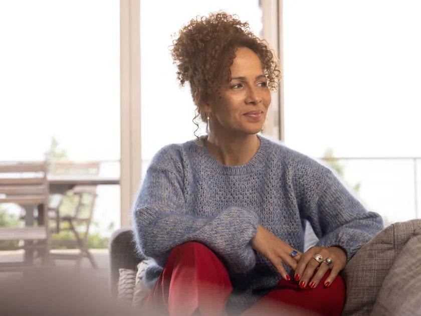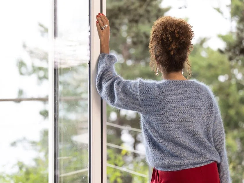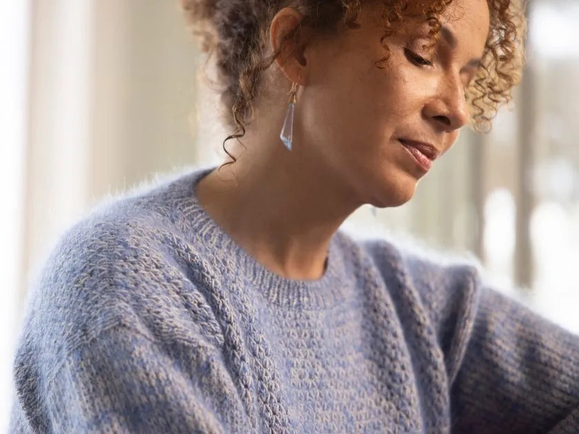 Into Thin Air er strikket i et fint mønster, der nærmest ligner små iskrystaller. Mønsteret giver minder om det snedækkede bjerg, designeren oplevede under en rejse til Everest Base Camp i 2010. At stå ved foden af verdens højeste bjerg, hvor folk vandrede opad imod tyndere luft. Mønsteret dannes af en slags vævestrik, som giver en smuk dybde og struktur.