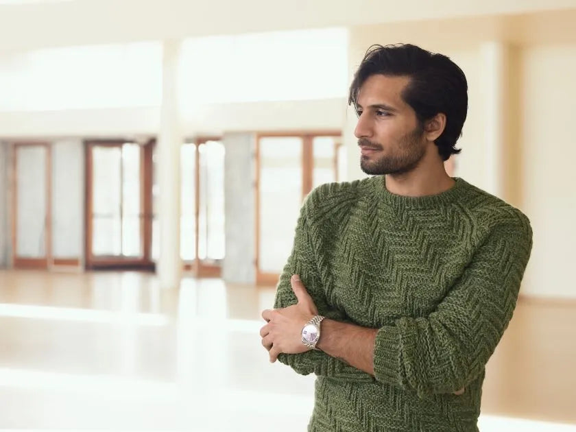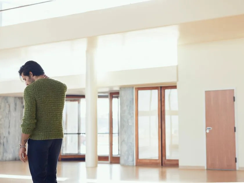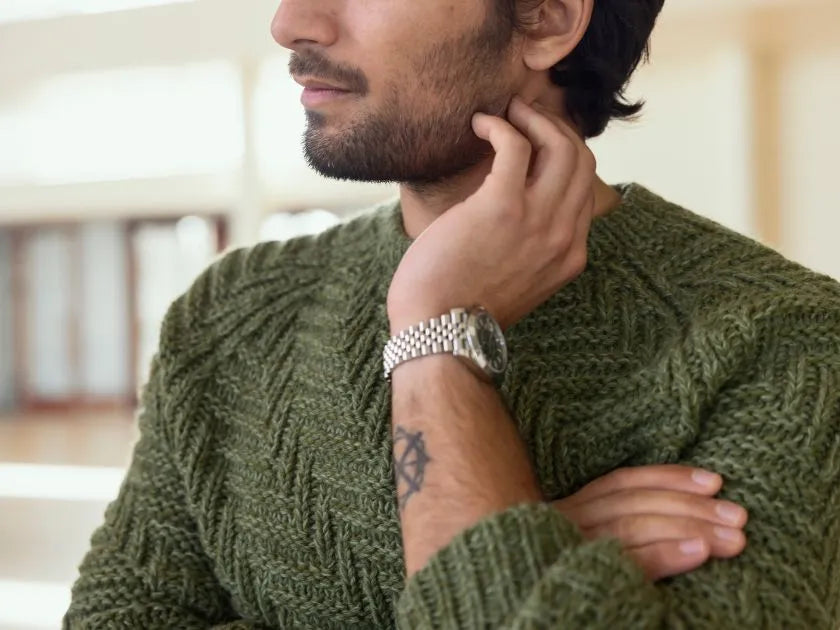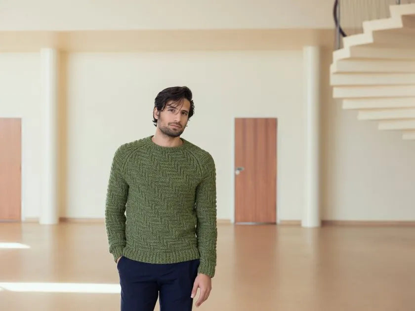 Denne klassiske herresweater er strikket i et strukturmønster, der leder tankerne hen på de prisvindende byggerier VM-Husene og Bjerget i den københavnske bydel Ørestad.