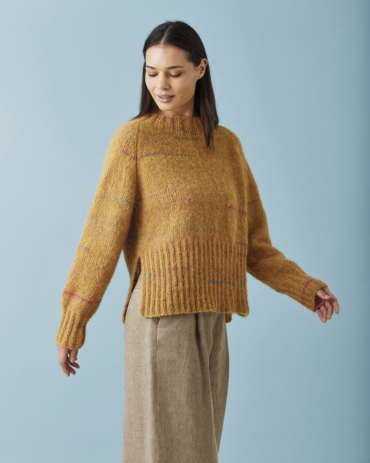 | Beskrivelse: | Sweateren strikkes oppefra og deles i siderne under ærmerne til slids. Alle str. strikkes på samme måde i halskantens rib. Der strikkes halsudskæring ved vende p efter ribkanten. |