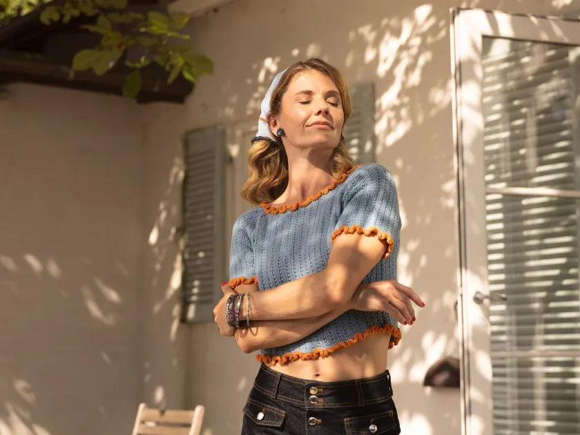 Shock Waves er skabt til at kombinere legende charme med et moderne udtryk. De fine detaljer, der skaber pasformen, og den bløde flæsekant giver tilsammen designet et både ungt og rebelsk udtryk,der skiller sig ud fra det klassiske. Den korte pasform gør den let og moderne, perfekt til højtaljede shorts eller en sommerlig nederdel.