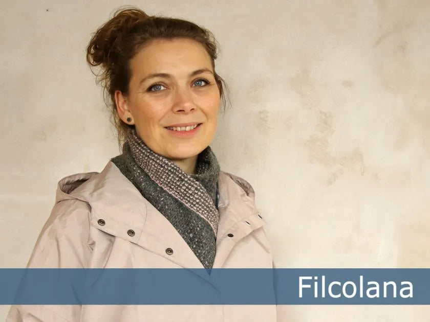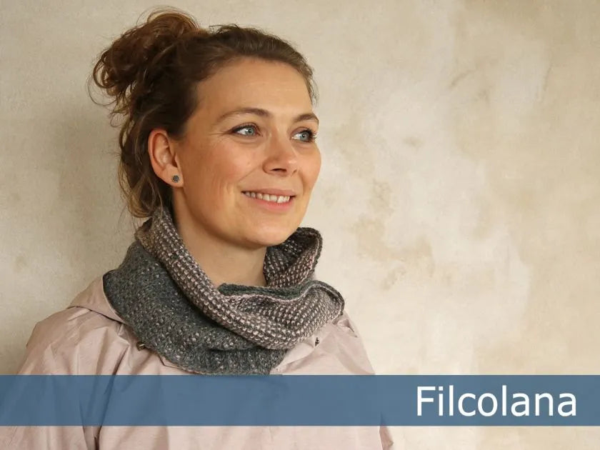 Halsrøret er hæklet i tunesisk hækling. Tunesisk hækling er både en ny og gammel teknik der giver et helt specielt udtryk. Med den dobbelte hæklenål kan der hækles
