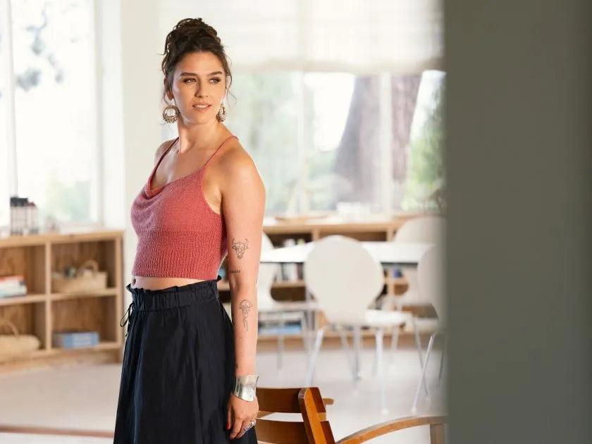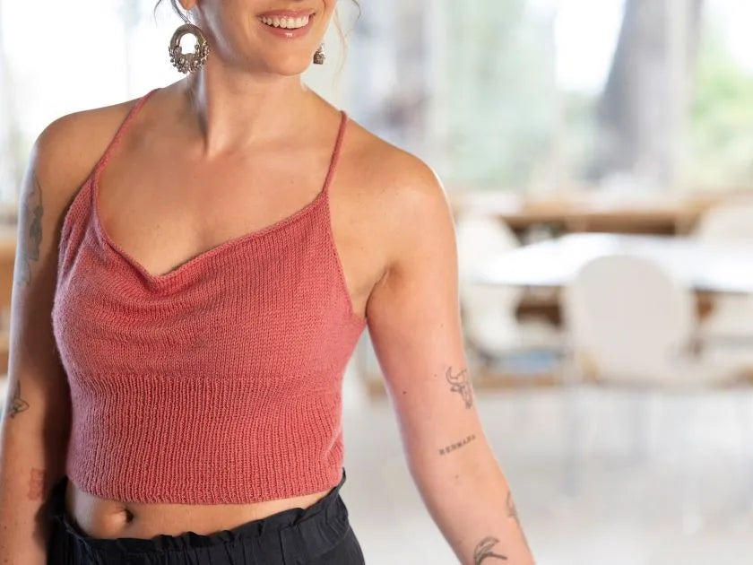 Denne elegante top leger med enkelhed og raffinerede detaljer. Forstykket er strikket med et smukt vandfald, der skaber bløde draperinger foran og giver et feminint og levende udtryk. Det lette fald i strikken understreger toppens bevægelse og gør den både behagelig og klædelig.